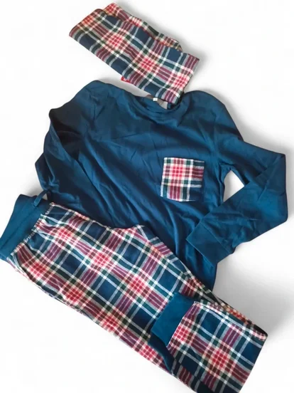 toller Pyjama von Little Kids dunkelblau rot kariert. Langarm-Shirt mit rotem Rundhalsausschnitt und karierter Brusttasche und karierte lange Hose mit Gummibund und Schürung. Inklusive Stoffbeutel.