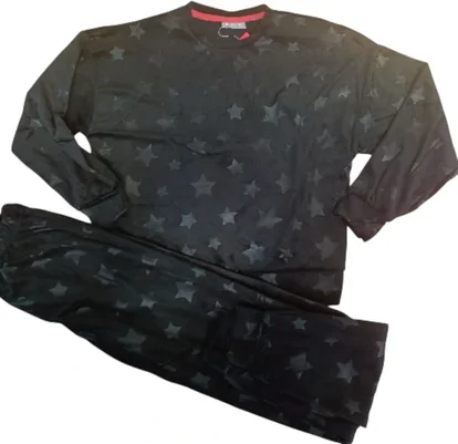toller schwarzer Samt-Pyjama von Destination mit schwarzen Sternen. Langarm-Shirt mit Rundhalsausschnitt, lange Hose mit Gummibund.