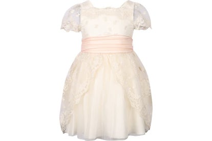 Ein bezauberndes Kleid aus besticktem Tüll. Mit kontrastierendem Schärpengürtel.