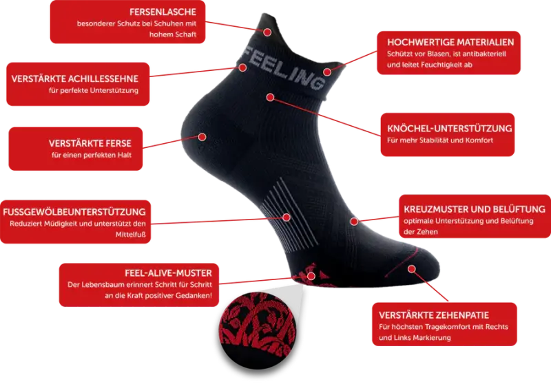 Mit den atmungsaktiven NEURO-FEELING No Show Socken spürst du bei jedem Schritt die Verbindung zu dir und zur Natur. Hochwertigste Materialien sorgen für eine perfekte Passform. Unser weltweit einzigartiger Feel-Alive-Lebensbaum auf der Unterseite sorgt für Kraft und Stabilität und ist dein "Anker", der dich täglich daran erinnert, dass du durch positive Gedanken deine Ziele Schritt für Schritt auch erreichst!