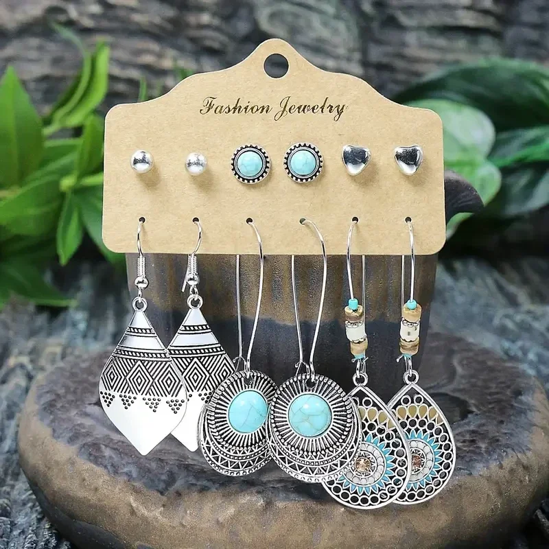 Damen-Ohrringe im Bohemian-Ethno-Stil, modische Kombination aus hängenden Ohrringen und Steckern, silbernes 6teiliges Set.