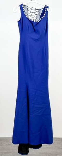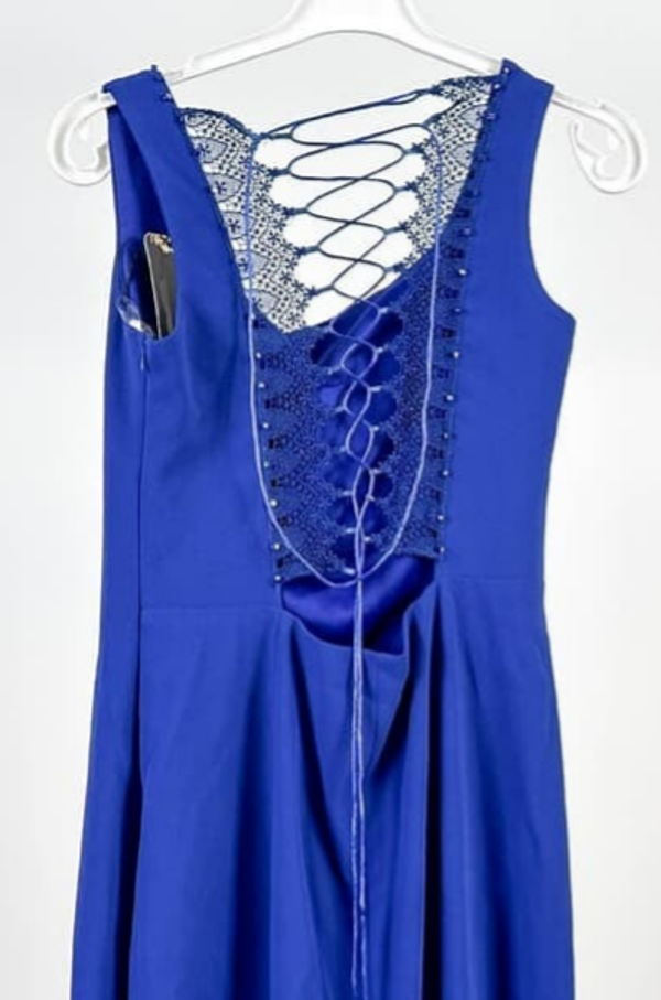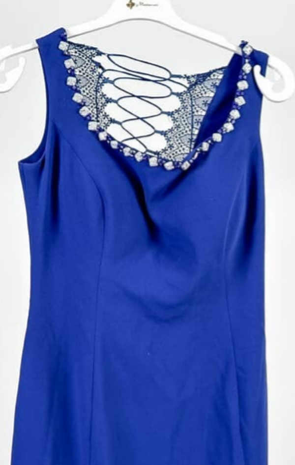 wunderschönes Abendkleid Cocktailkleid von Fikret Kusoglu in Königsblau, hinten mit Spitzeneinsätzen und Schnürung, Auschnitt mit Steinchen besetzt, bodenlang.