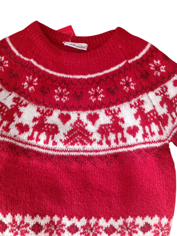 Toller Kinder Strickpullover rot weiß mit weihnachtlichem Rentier und Tannen Motiv von so cute.