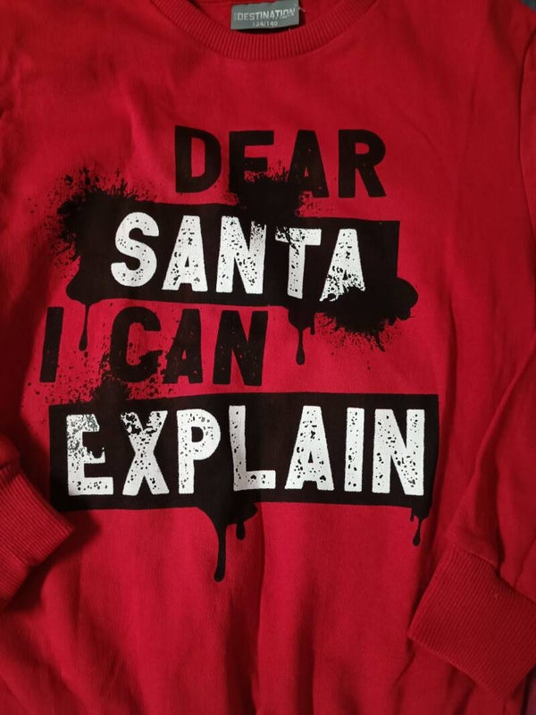 rotes Sweatshirt von Boys Destination mit schwarzem Schriftzug Santa I can explain. Rundhalsausschnitt