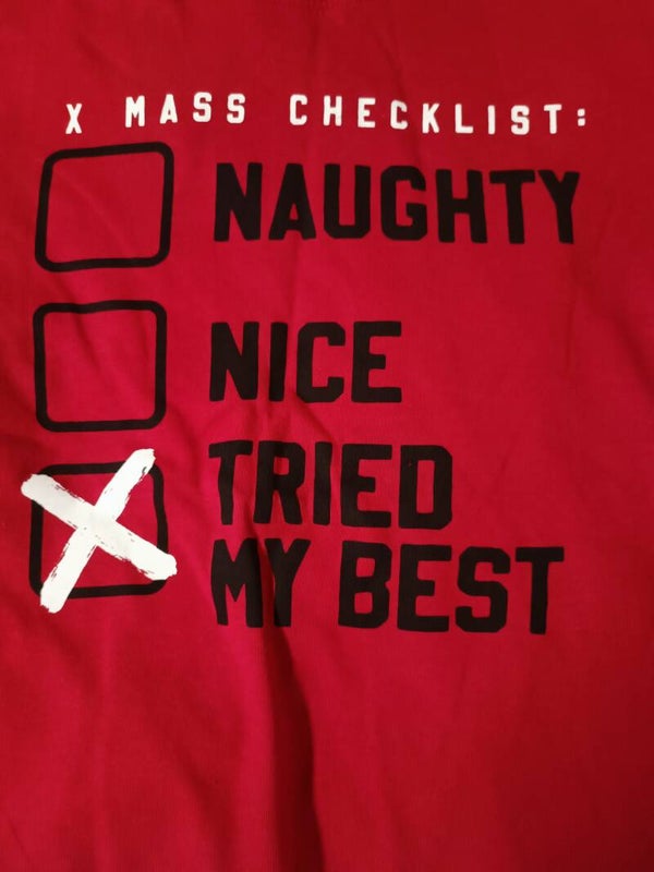 rotes Sweatshirt von Boys Destination mit X Mas Checklist Druck, Rundhalsausschnitt.