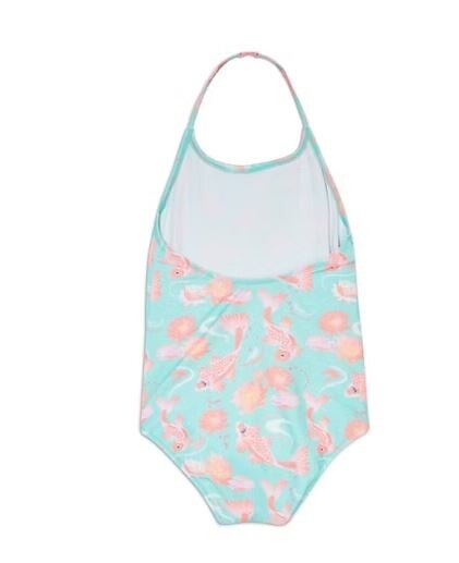 Neckholder-Badeanzug Aqua Koi für Mädchen hat ein bezauberndes, japanisch inspiriertes Design und einen Rundhalsausschnitt mit Rüschen, den Ihre kleine Tochter bei einem lustigen Tag am Strand oder am Pool lieben wird.