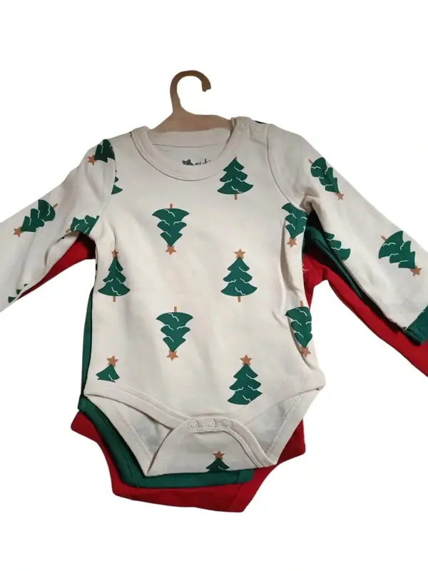 tolle 3er Packung Bodies von socute mit weihnachtlichen Motiven ein roter Body mit Weihnachtsmann Motiv ein weißer mit Tannenbaum Motiv und ein unifarbener grüner Body.