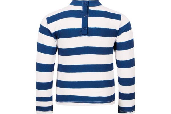 Schwimm-T-Shirt mit Trompe-l’œil-Effekt und UPF 50+ von Stella McCartney. Piratenmuster auf weiß-blau gestreiftem Hintergrund.
