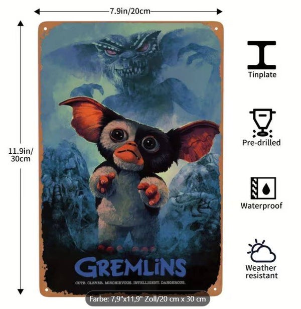 Vintage Gremlins Metallschild, 20.07cm x 30.23cm, langlebig und wasserdicht, perfektes nostalgisches Geschenk für Filmbegeisterte und Retro-Filmfans