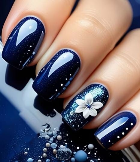 tolle dunkelblaue Kunstnägel mit weißem Blumen Motiv