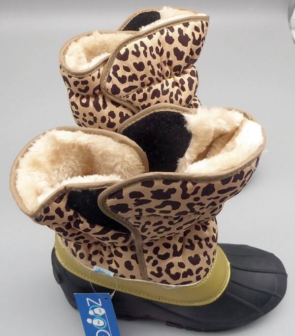 stylische Moonboots von Zoogs unten schwarz oben Leoparden-Muster, warme Fütterung