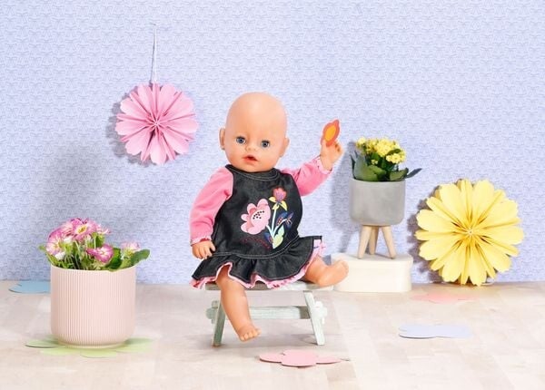 Blumenkinder sind die besten Klamotten-Tauscher. Dank des lässigen Schnitts können BABY born, Baby Annabell und andere Puppen in einer Größe von 39-46 cm fröhlich die Kleidung hin und her tauschen.Das Jeans Kleid mit den pinken Ärmeln kann ganz cool im Kindergarten oder auch zu schicken Anlässen getragen werden. Die Blumen-Applikationen auf dem Stoff in Jeans-Optik sind besonders raffiniert gestickt. Am Saum des rüschigen Rocks und an den Ärmel schaut ein verspieltes Blütenmuster hervor.